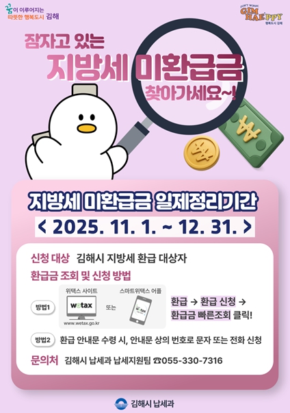 [뉴스스텝] 김해시는 납세자가 돌려받을 지방세 환급금을 제때 찾아갈 수 있도록 11~12월 ‘2025 지방세 미환급금 일제정리 기간’을 운영한다고 31일 밝혔다.