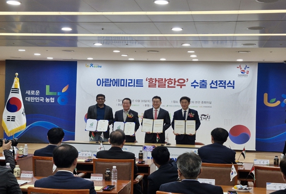 [뉴스스텝] 대한민국 축산물 브랜드경진대회에서 2019년, 2021년, 2023년 대통령상을 수상한 강원특별자치도 통합브랜드 ‘강원한우’가 10월 30일 서울 농협중앙회 본관에서 ‘강원한우 아랍에미리트(UAE) 수출 선적식’을 개최했다.