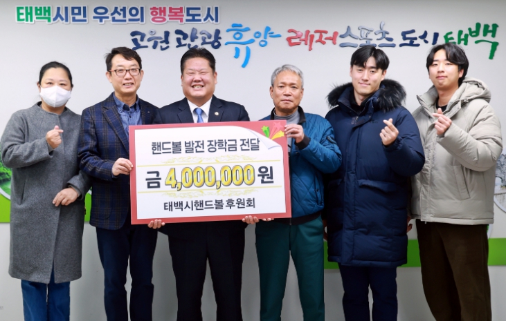 [뉴스스텝] 태백시는 태백시핸드볼후원회(회장 우병선)가 지역 핸드볼 꿈나무 육성을 위해 총 400만 원 규모의 핸드볼 발전 장학금을 관내 4개 학교(황지초등학교, 세연중학교, 황지정보산업고등학교, 철암고등학교)에 전달했다고 밝혔다.