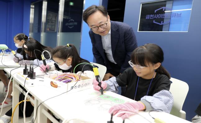 ▲ 유성훈 금천구청장이 금천사이언스큐브 프로그램에 참여하고 있는 학생을 격려하고 있다 |