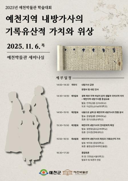 [뉴스스텝] 예천군 예천박물관은 11월 6일 오후 2시 ‘예천지역 내방가사의 기록유산적 가치와 위상’이란 주제로 학술대회를 개최한다.
