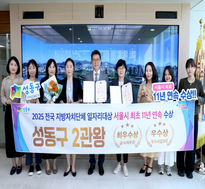 [뉴스스텝] 서울 성동구가 ‘2025년 전국 지방자치단체 일자리대상’에서 공시제 부문 ‘최우수상’과 우수사업 부문 ‘우수상’을 수상하며 2관왕 달성과 동시에 2015년부터 11년 연속 수상이라는 대기록을 세웠다고 밝혔다.