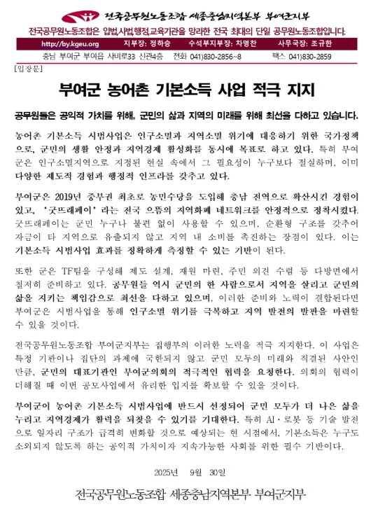 공무원노조 부여군지부, 농어촌 기본소득 시범 사업 적극 지지