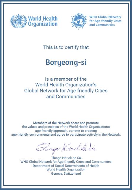 보령시는 지난 8월 WHO에 가입 신청서를 제출한 후, 고령친화도시 조성계획의 체계성, 시민 참여도, 고령자 친화적 정책 추진성과 등을 종합적으로 검토받아 최종 인증을 획득했다.