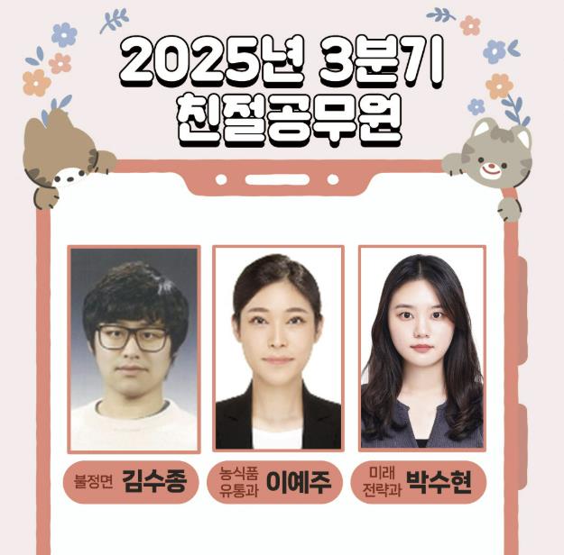 [뉴스스텝] 충북 괴산군은 2025년 3분기 친절공무원으로 김수종 주무관(불정면사무소), 이예주 주무관(농식품유통과), 박수현 주무관(미래전략과)을 선정했다고 밝혔다.