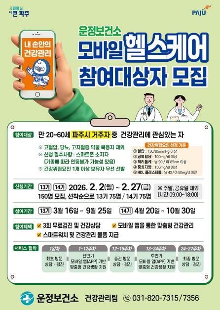 [뉴스스텝] 파주시 운정보건소는 시민의 자가 건강관리 능력 향상과 만성질환 예방을 위해 2026년 ‘모바일 헬스케어 사업’참여자를 모집한다.