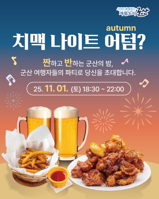 [뉴스스텝] 깊어가는 가을밤, 군산시가 탁 트인 야외에서 즐기는 특별한 행사 ‘치맥나이트 어텀(Autumn)?’을 11월 1일 저녁 군산 내항 일원에서 개최한다.