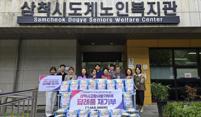 [뉴스스텝] 삼척시는 (사)강원특별자치시대 재울산삼척시민회가 9월 10일, 삼척 특산물 ‘삼척동자 맑은쌀 10kg 122포’(366만 원 상당)를 도계노인복지관에 전달하며 고향사랑기부금 답례품을 다시 기부하는 나눔을 실천했다고 밝혔다.