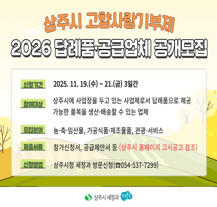 [뉴스스텝] 상주시는 2026년 고향사랑기부제에 참여할 답례품 공급업체를 오는 21일까지 공개모집 한다.