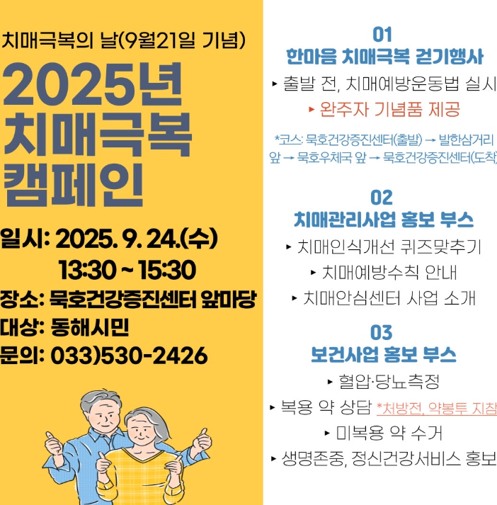 [뉴스스텝] 동해시는 2025년 치매극복의 날(9월 21일)을 맞아 치매에 대한 인식개선과 예방·관리의 중요성을 널리 알리기 위해 오는 9월 24일 오후 1시 30분 묵호건강증진센터 앞마당에서 기념 캠페인을 개최한다.