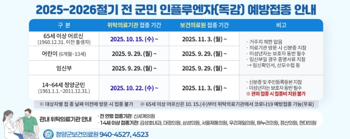 ▲14~64세 청양군민은 오는 22일부터 위탁의료기관, 11월 3일부터 보건의료원에서 무료 접종하며 백신 소진 시까지 진행한다.
