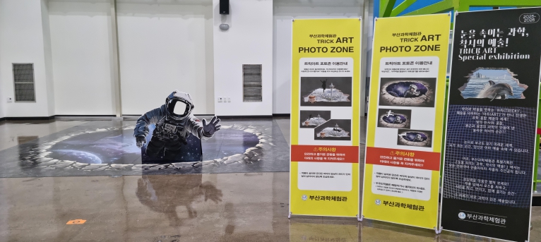트릭아트존은 ‘우주 속 과학 여행’과 ‘부산의 랜드마크’를 주제로 착시와 시지각 원리를 활용한 초대형 2종 작품으로 구성했다. 빛의 굴절, 원근법, 착시 효과 등을 활용해 관람객이 작품 속 주인공이 된 듯 사진 촬영을 즐길 수 있으며, 다양한 관점에서 관찰하며 과학적 상상력을 넓일 수 있다.