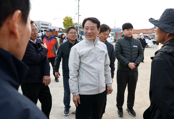 ▲ 강진원 강진군수가 지난 11일 수매현장을 방문해 격려하고 있다.