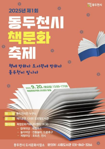 올해 처음 열리는 이번 축제는 “책에 반하다, 도서관에 반하다, 동두천이 빛나다”를 주제로 오후 1시 아트렛 공연팀의 재즈 공연을 시작으로 오후 1시 30분 개막식과 시상식이 진행된다. 이어 오후 2시부터는 야외마당에서 온 가족이 함께 즐길 수 있는 다양한 체험 부스와 문화 프로그램이 펼쳐진다.