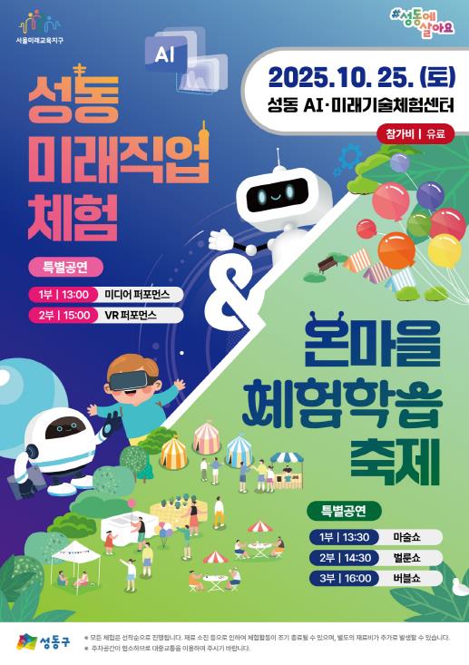 [뉴스스텝] 서울 성동구가 오는 10월 25일 성동 AI‧미래기술체험센터 일대에서 '성동 미래직업체험 · 온마을체험학습 축제'를 개최한다고 밝혔다.