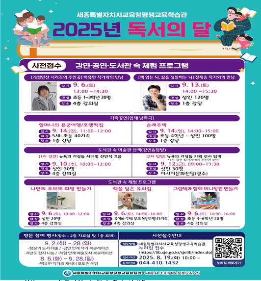 [뉴스스텝] 세종특별자치시교육청평생교육학습관(관장 김희경)은 2025년 독서의 달을 맞아 지역 주민의 독서 의욕을 고취하고 독서 문화 진흥에 대한 관심과 참여를 유도하기 위해 다양한 독서문화행사를 운영한다.