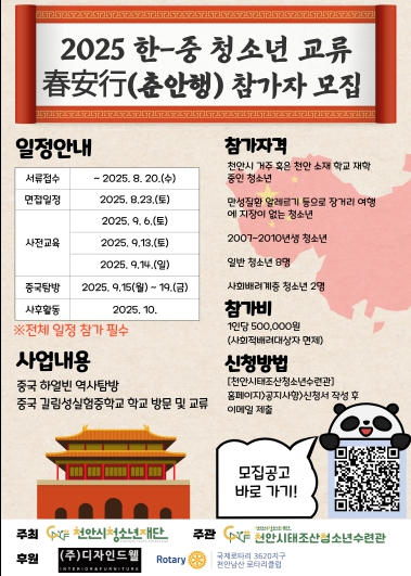 [뉴스스텝] (재)천안시청소년재단 천안시태조산청소년수련관은 오는 20일까지 ‘2025 한-중 청소년 교류 春安行(춘안행)’ 참가 청소년을 모집한다고 13일 밝혔다.