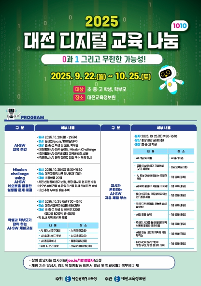 [뉴스스텝] 대전교육정보원은 ‘0과 1 그리고 무한한 가능성’을 주제로 ‘2025년 대전 디지털 교육 나눔1010’ 행사를 9월 22일부터 10월 28일까지 5주간 초·중·고 학생, 교원, 학부모를 대상으로 다채로운 온·오프라인 프로그램을 기획하여 성황리에 운영했다고 밝혔다.