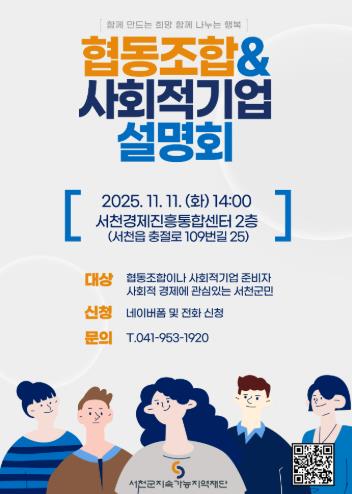 [뉴스스텝] (재)서천군지속가능지역재단은 오는 10월 20일 오후 2시, 서천경제진흥통합센터에서 ‘협동조합·사회적기업 설명회’를 연다.