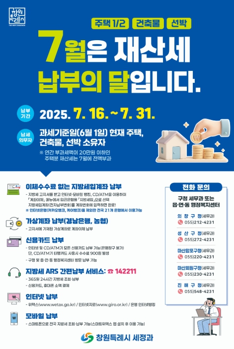 [뉴스스텝] 창원특례시는 주택(단독주택, 아파트), 건축물(상가, 공장 등), 선박에 대해 2025년 7월 정기분 재산세 49만 6,617건에 1,169억 원을 부과했다고 밝혔다.