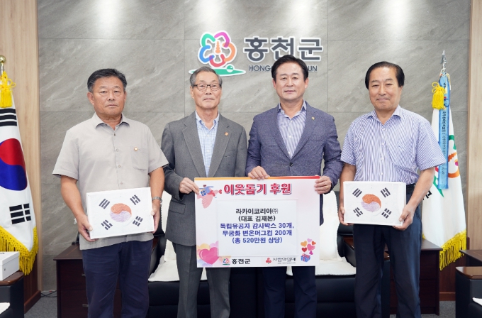 [뉴스스텝] 라카이코리아(주)(대표 김재본) 은 8월 12일 홍천군청에 방문하여, 총 520만 원 상당의 독립 유공자 감사 박스 30개와 무궁화 변온 머그컵 200개를 전달했다.