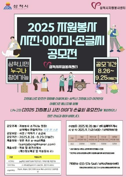 이번 공모전은 ‘자원봉사 온기나눔 맛집! 삼척에서 만들어가는 희망 한 스푼’을 주제로, 사진·이야기·손글씨 3개 부문으로 진행된다. 자원봉사에 대한 가치와 보람을 시민과 함께 공유하고 홍보하는 취지로 마련됐으며, 삼척시민 누구나 참여할 수 있다.