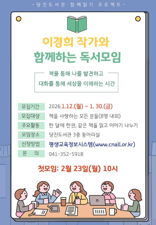 [뉴스스텝] 당진교육지원청당진도서관은 오는 1월 12일부터 당진 출신 중견 소설가 이경희 작가와 함께하는 독서모임 신규 회원을 모집한다.