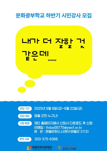 [뉴스스텝] (재)영월문화관광재단(대표이사 박상헌)은 법정 문화도시 조성사업의 목적으로 추진되는 '시민강사 프로젝트' 하반기 참여자를 8월 8일부터 22일까지 모집한다고 밝혔다.