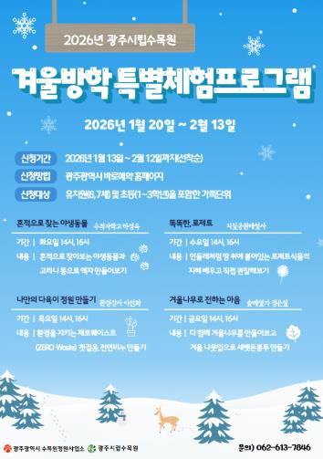 [뉴스스텝] 광주광역시 시립수목원은 어린이를 위한 ‘2026년 겨울방학 체험 프로그램’ 참가자 640명을 오는 13일 오전 10시부터 선착순 모집한다.