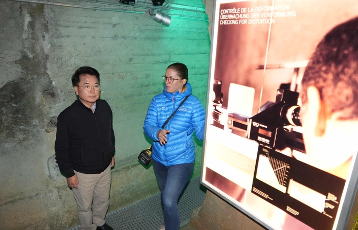 ▲ 육동한 춘천시장과 춘천시 대표단이 현지시간 21일 스위스 그랑데디상스 댐을 둘러보며 설명을 듣고 있다. |