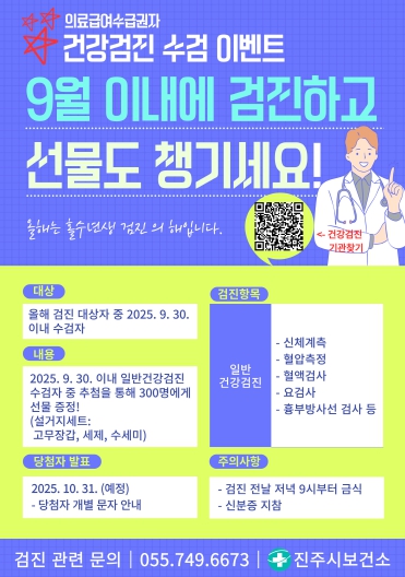 진주시는 의료 사각지대에 놓인 취약계층을 보호하고, 질병의 예방과 조기 발견을 위해 의료급여 수급권자를 대상으로 일반건강검진 수검 장려 이벤트를 실시해 선물을 증정한다.