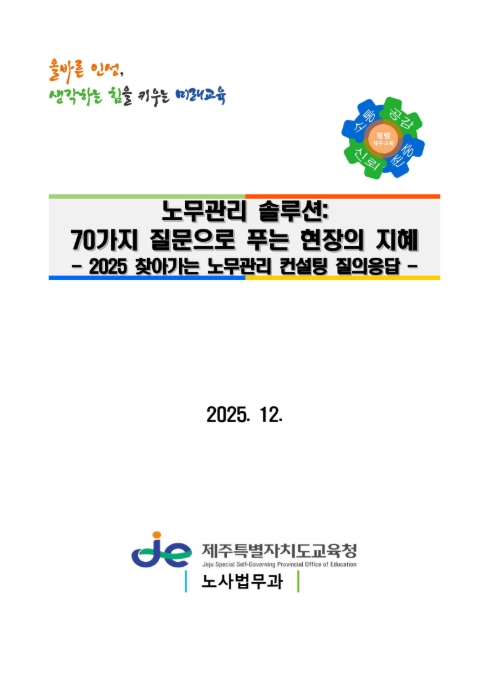 [뉴스스텝] 제주특별자치도교육청은 5일 ‘노무관리 해결책(솔루션): 70가지 질문으로 푸는 현장의 지혜–2025 찾아가는 노무관리 컨설팅 질의응답’ 자료집을 제작·배포한다.