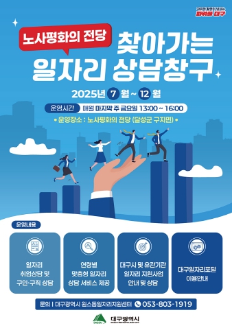 [뉴스스텝] 대구광역시는 매월 마지막 주 금요일 오후 1시부터 4시까지, 달성군 구지면에 위치한 노사평화의 전당에서 ‘찾아가는 일자리 상담창구’를 운영한다.