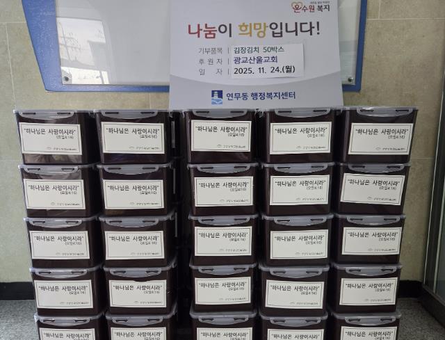 공순정 연무동장은 “추운 겨울을 앞두고 따뜻한 정성을 담아 김장김치를 기부해주신 광교산울교회에 깊이 감사드린다”며 “기부해주신 김치는 꼭 필요한 이웃들에게 소중히 전달하겠다”고 전했다.