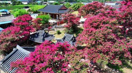[뉴스스텝] 짙푸른 하늘 아래 붉게 피어난 배롱나무 꽃이 고택의 지붕을 감싸 안는다. 정읍시 태인면 서현사지에 여름이 물들었다.