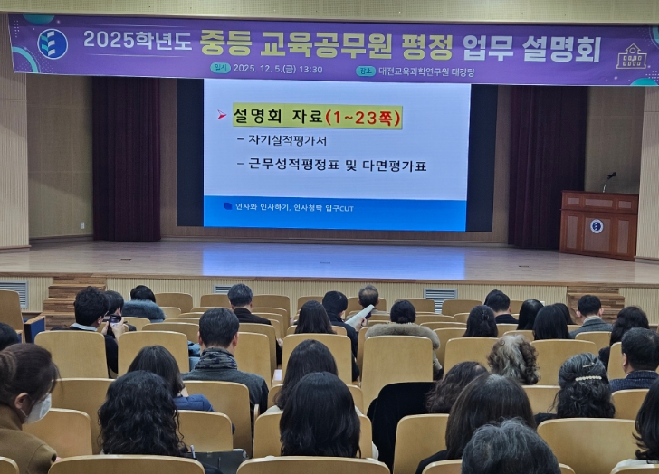 [뉴스스텝] 대전시교육청은 12월 5일, 8일 양일간 대전교육과학연구원에서 중·고·각종·특수학교 교감과 교사, 교육전문직원을 대상으로 2025학년도 중등 교육공무원 평정 업무 설명회를 개최했다.