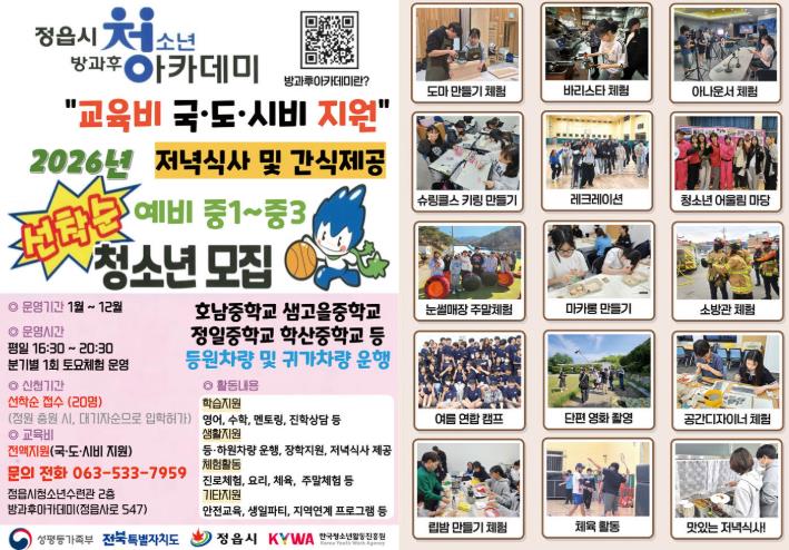 [뉴스스텝] 정읍시와 성평등가족부가 지원하는 정읍시 청소년방과후아카데미가 지역 청소년들의 건강한 성장과 역량 개발을 돕기 위해 2026년도 신입생 모집에 나섰다.