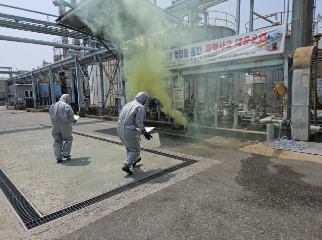 이번 훈련은 ㈜SH에너지화학의 소방차 지원과, 내일기업(주) 혁신제품인 흡착포를 활용한 기업 간 상호지원 협업으로 이뤄졌으며, 원인 미상의 물질을 검지하여 사고 발생 시 신속한 대응을 할 수 있게 진행됐다.