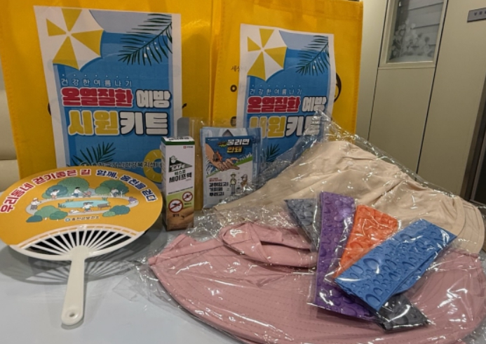 온열질환 예방 “시원 키트”는 쿨토시, 쿨스카프, 햇빛 차단 모자, 부채, 벌레 기피제 등 불볕더위에 대응할 수 있는 실질적인 물품으로 구성했다.