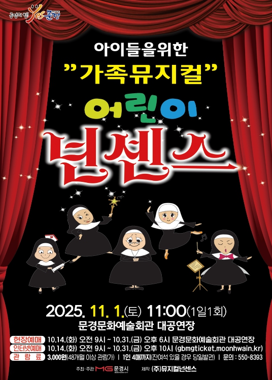 [뉴스스텝] 문화예술회관에서는 11월 기획공연으로 화끈하고 재미있는 수녀들의 이야기를 담은 뮤지컬 ‘어린이 넌센스’공연을 11월 1일 11:00에, 뮤지컬‘넌센스’공연을 11월 1일 17:00에 각각 문경문화예술회관 대공연장에서 진행한다.
