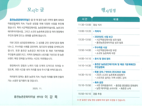 성과 발표에서는 (사)홍천농촌지역관광사업단이 홍천농촌문화터미널을 위탁 운영하며 추진한 지역단위 농촌관광사업, 소규모 농촌축제 지원사업, 2025년 시군역량강화사업 추진 성과 발표와 우수마을 시상이 진행된다.