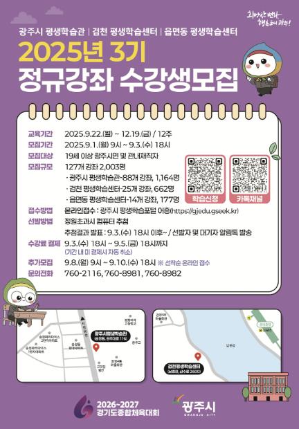 수강 신청은 광주시에 거주하거나 지역 내 직장에 다니는 시민 누구나 가능하며 접수는 광주시 평생학습관 ‘어흥’ 홈페이지에서 온라인으로 할 수 있다. 선발은 공정성을 위해 컴퓨터 무작위 추첨 방식으로 진행된다.