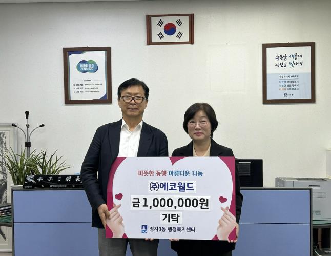 [뉴스스텝] 주식회사 에코월드는 지난 29일, 추석 명절을 앞두고 수원시 장안구 정자3동에 이웃돕기 성금 100만원을 기탁했다. 이번 기부금은 명절을 맞아 도움이 필요한 우리 이웃들에게 소중히 전달될 예정이다.