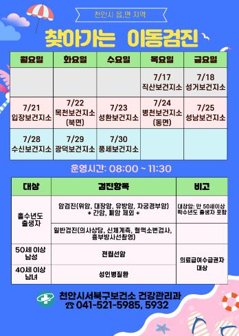 이동건강검진 일정은 ▲17일, 직산보건지소 ▲18일, 성거보건지소 ▲21일, 입장보건지소 ▲22일, 목천보건지소 ▲23일, 성환보건지소 ▲24일, 병천보건지소 ▲25일, 성남보건지소 ▲28일, 수신보건지소 ▲29일, 광덕보건지소 ▲30일, 풍세보건지소 순으로 진행한다.