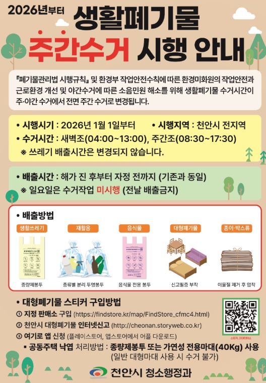 [뉴스스텝] 천안시는 근로자의 안전 확보와 안정적인 수거체계 확립을 위해 내년부터 생활폐기물 야간 수거를 폐지하고 주간에만 수거한다고 5일 밝혔다.