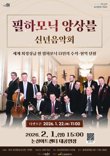 (재)논산문화관광재단 관계자는 “이번 음악회를 통해 시민의 문화예술 향유 기회가 확대되고, 지역 문화 수준이 한 단계 도약하는 계기가 될 것으로 기대한다”며 “세계적인 연주자들의 공연을 가까이에서 즐기며, 새해의 희망과 감동을 만끽하시길 바란다”고 말했다.