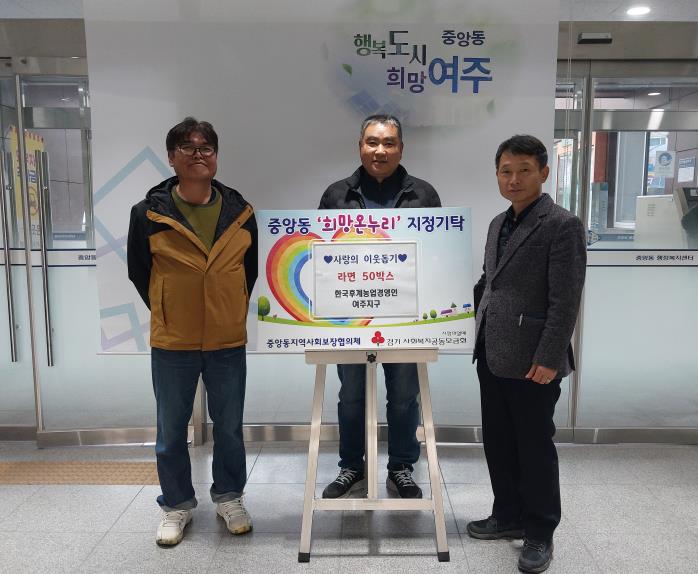| ▲ 한국후계농업경영인 여주지구, 중앙동에 라면 50박스 기탁 |