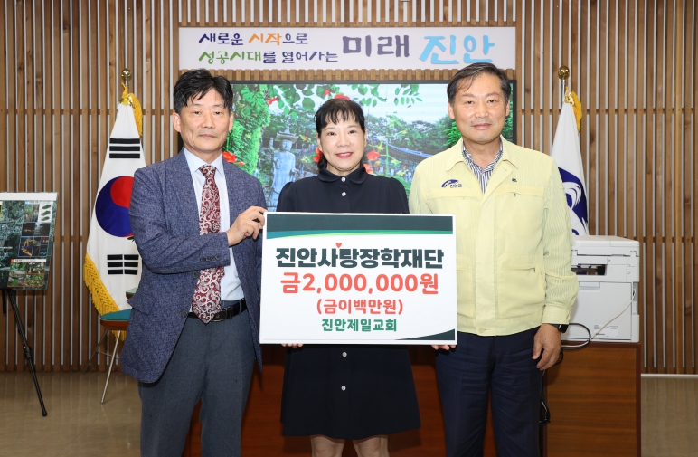 [뉴스스텝] 진안제일교회가 진안사랑장학재단(이사장 전춘성)에 장학금 200만원을 기탁했다.