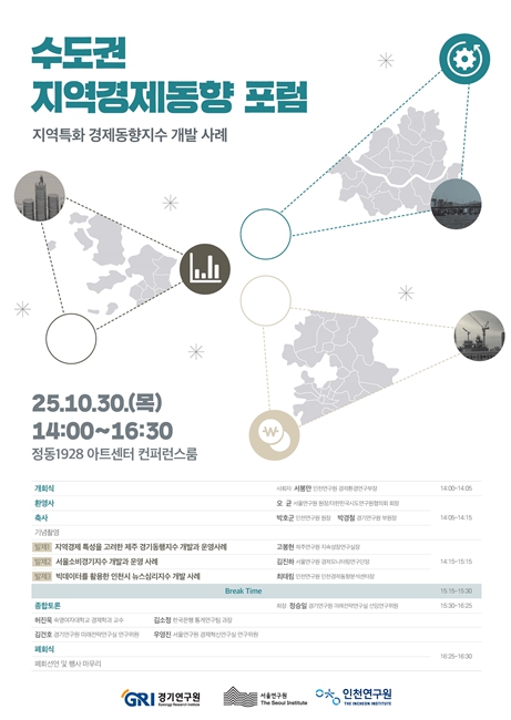 [뉴스스텝] 인천연구원은 2025년 10월 30일 오후 2시부터 정동1928 아트센터 컨퍼런스룸에서 “지역특화 경제동향지수 개발 사례”를 주제로 '수도권 지역경제동향 포럼'을 개최한다.