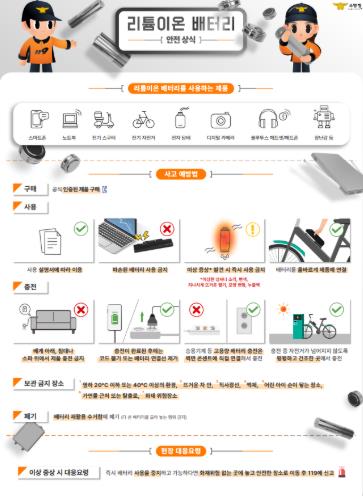 군민이 일상에서 쉽게 실천할 수 있는 안전수칙으로△KC 인증 제품 및 정품 충전기 사용 △충전이 완료되면 반드시 전원 코드 뽑기 △ 고온·저온(40℃ 초과 또는 -20℃ 이하) 환경에서 사용 금지 △ 배터리 이상 증상 시 즉시 사용 중지(예: 배터리 부풀음, 타는 냄새, 변색, 소리, 열감 등) △ 배터리는 불연성 바닥에서 충전하며, 침대·소파 위 사용 금지 △ 멀티탭보다는 벽면 콘센트에 직접 연결 △ 파손된 배터리 또는 수리 이력 있는 배터리 사용 금지 △충전 중 자리를 비우지 않도록 주의하고, 실내보다는 직사광선 없는 외부에서의 충전 등이 있다.